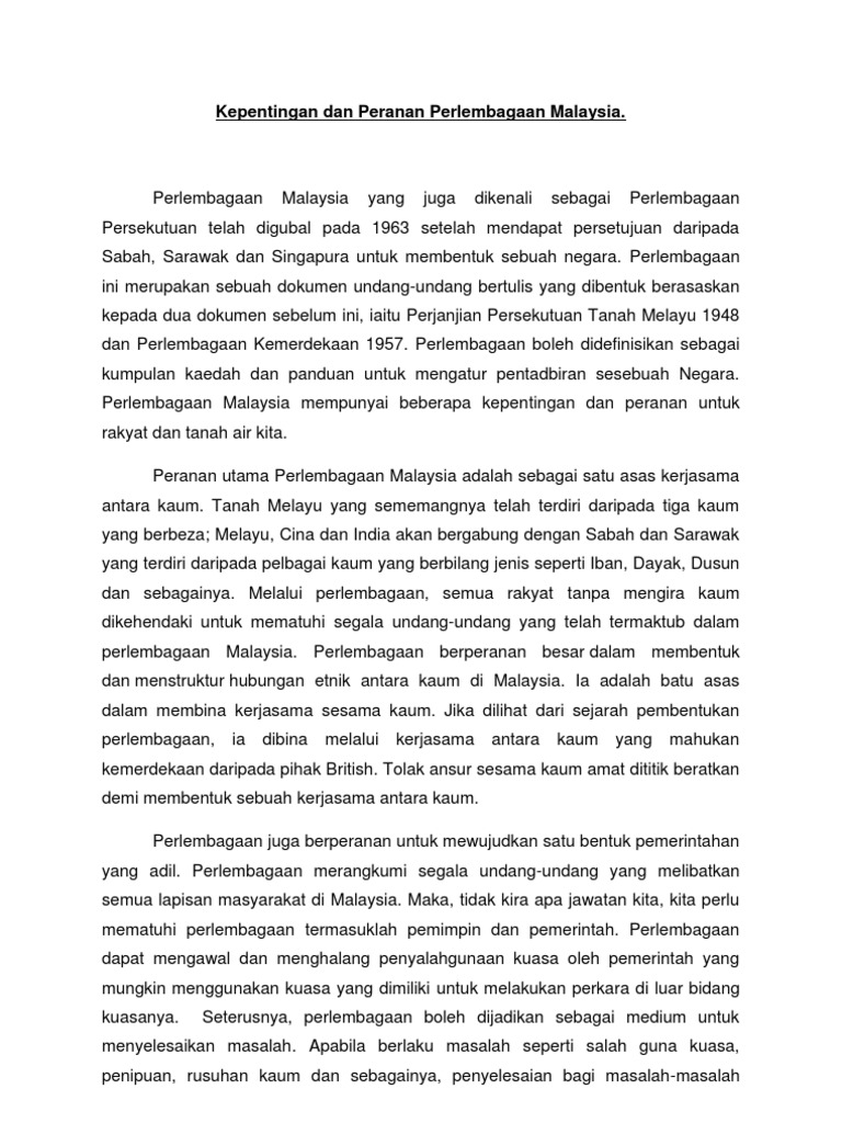 Peran sektor pertanian dalam mengurangi pengangguran. Kepentingan raja berperlembagaan dalam sebuah negara demokrasi seperti yang kita sedia maklum, malaysia mengamalkan sebuah sistem unik iaitu konsep raja perlembagaan yang bermaksud kuasa raja yang dibatasi oleh perlembagaan. Learn vocabulary, terms and more with flashcards, games and other study tools. F3 pindaan perlembagaan digubal untuk kepentingan negara dan rakyat. Akhir sekali, perlembagaan malaysia berperanan dalam mengekalkan hak keistimewaan golongan bumiputera iaitu orang melayu, sabah dan sarawak.