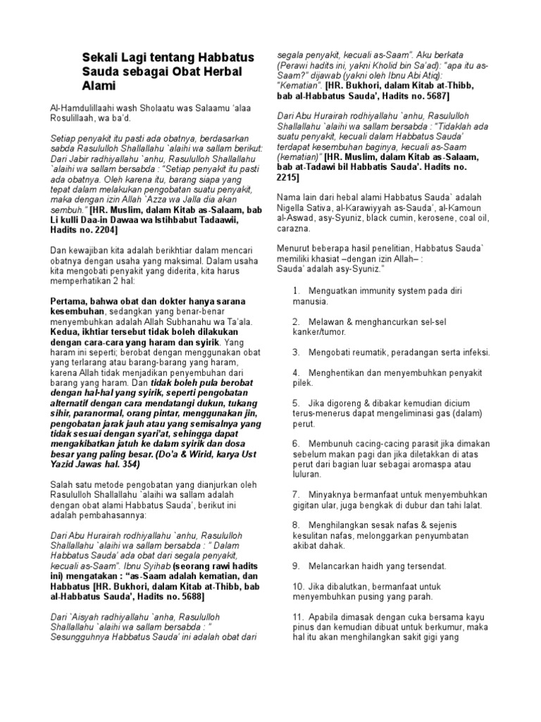 Makan beberapa titis minyak atau biji habbatussauda' untuk dimakan setiap pagi s ebelum sarapan. Apa itu habbatussauda atau jintan hitam? Sudah di dibuktikan secara ilmiah di berbagai negara maju dan dipatenkan sebagai. Manfaat habbatussauda dan cara penggunaan habbatussauda sebagai bahan pengobatanselama lebih dari dua ribu tahun habatussauda atau yang dikenal juga dengan nama jintan hitam di indonesia. Mengonsumsi habbatussauda adalah salah satu obat yang dianjurkan oleh rasulullah saw, namun tidak begitu dikenal oleh muslim indonesia.