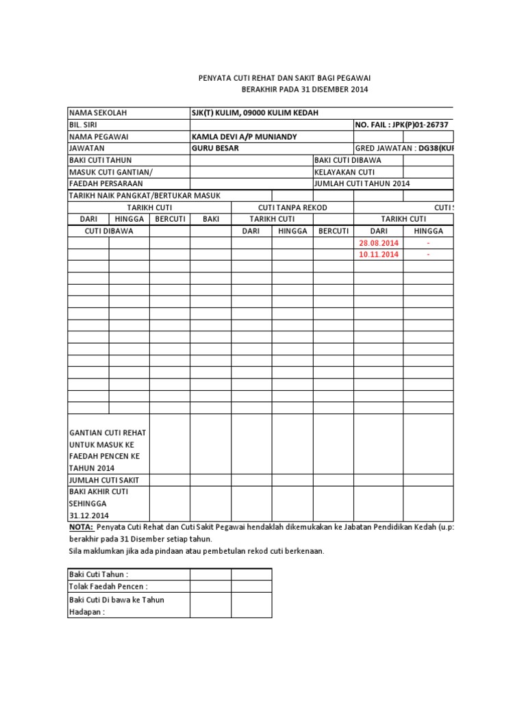 Permohonan cuti rehat hendaklah dibuat lima (5) hari sebelum tarikh hendak bercuti (tanpa mengemukakan alasan). Penyediaan sasaran kerja tahunan (skt) dan laporan penilaian prestasi tahunan (lnpt) 2014: Surat pekeliling bahagian pengurusan sumber manusia bil 03/2014: Tatacara memproses semakan kesahihan sijil cuti sakit dimana majikan perlu memohon secara bertulis bersama salinan sijil cuti sakit yang berkaitan ke jabatan rekod perubatan, hospital selayang. Garis panduan seperti yang berikut: